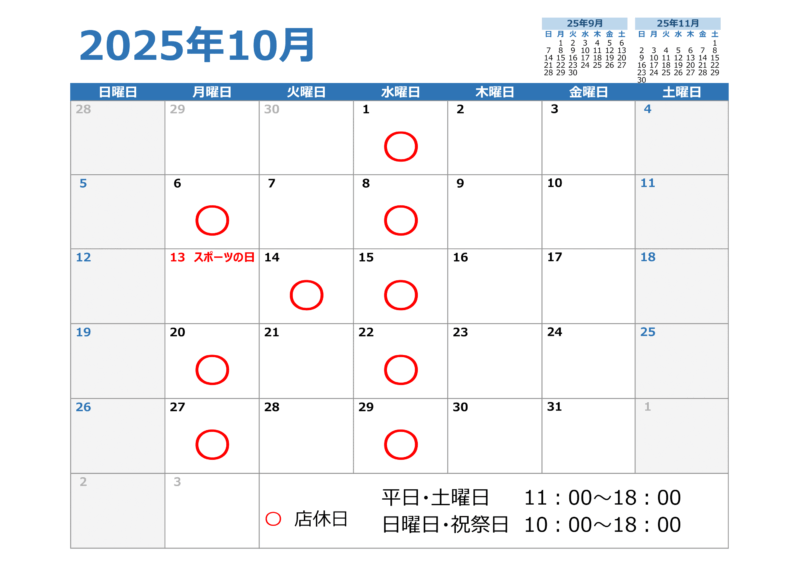 また10月13日(月)はスポーツの日で祭日ですので通常営業とさせて頂き